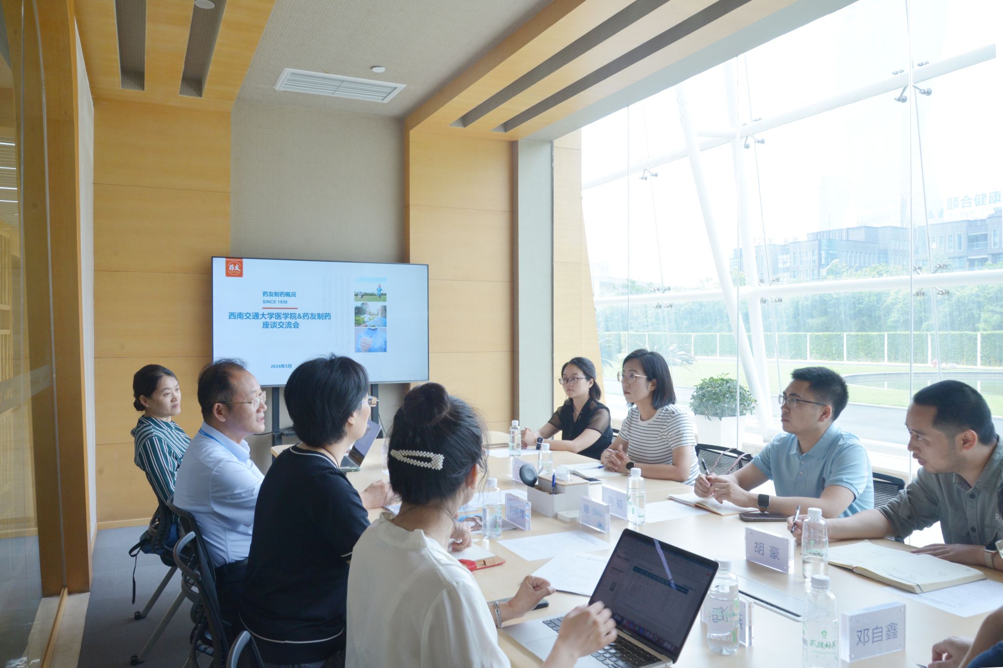 药友党委书记李洪溢热情欢迎学院领导的到来,并详细介绍了药友制药的发展历史、现有产品及其研发情况。于楠副书记分享了36365线路检测中心的教育资源和学生情况,表达了学院对于与企业合作的积极期待。