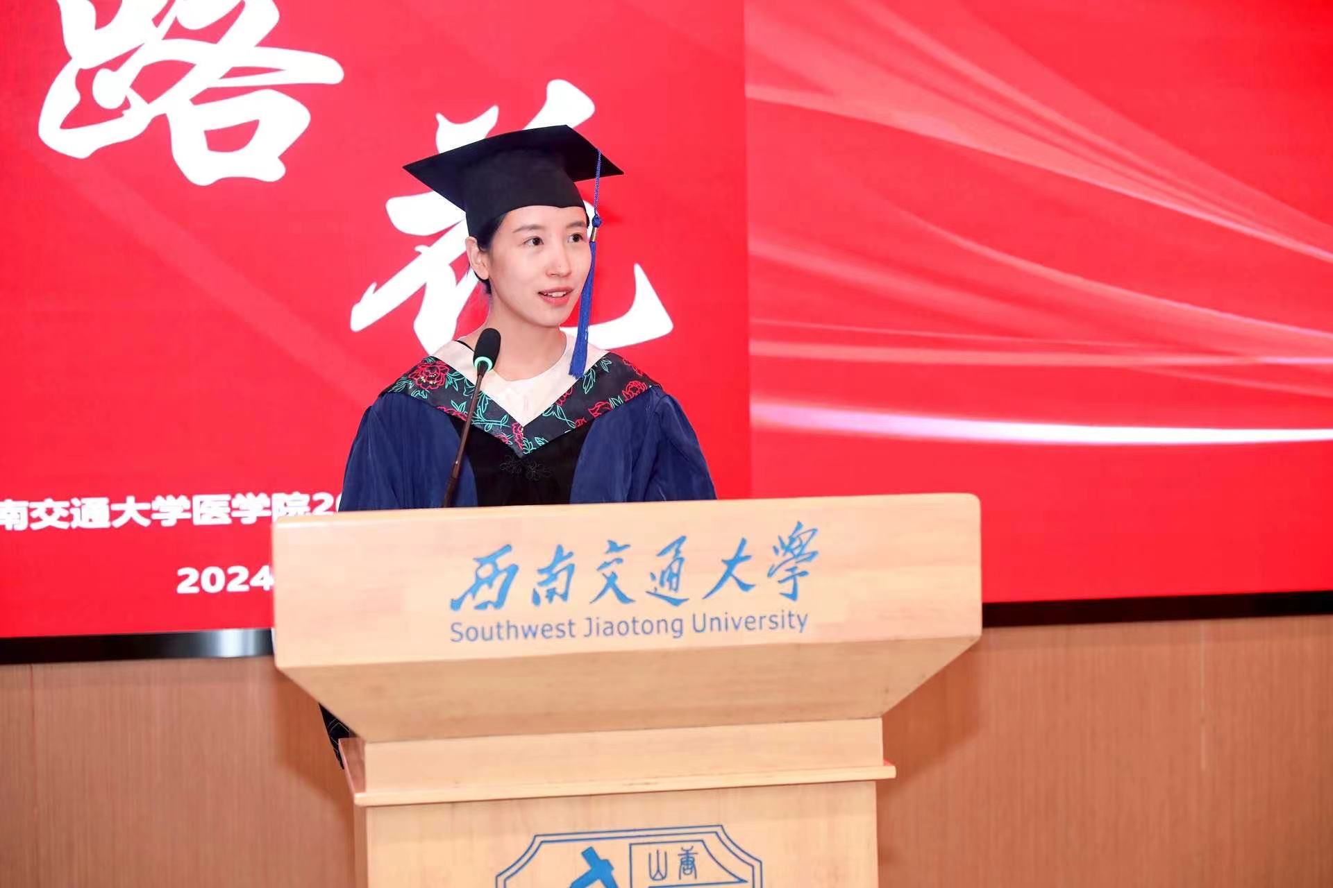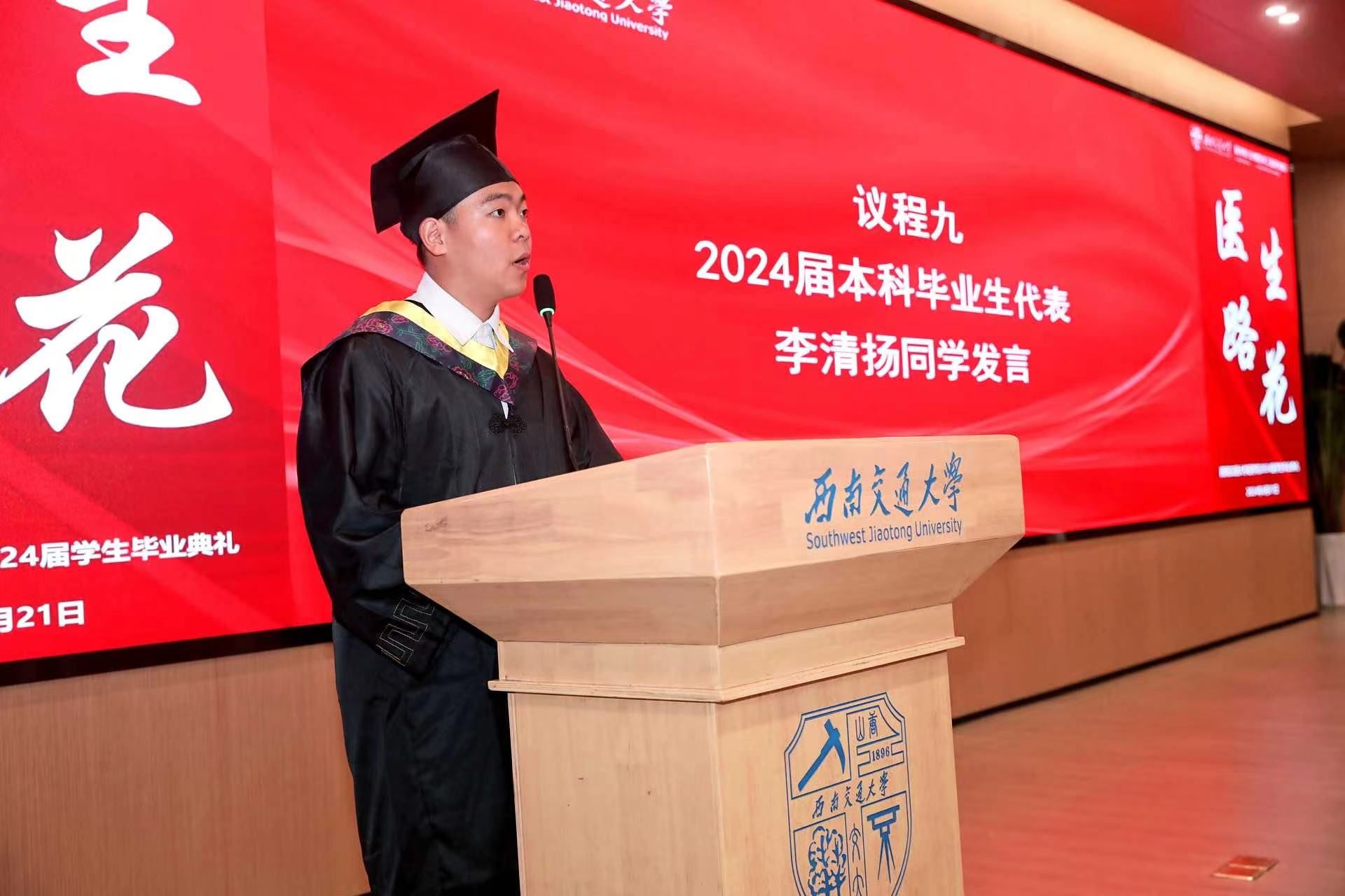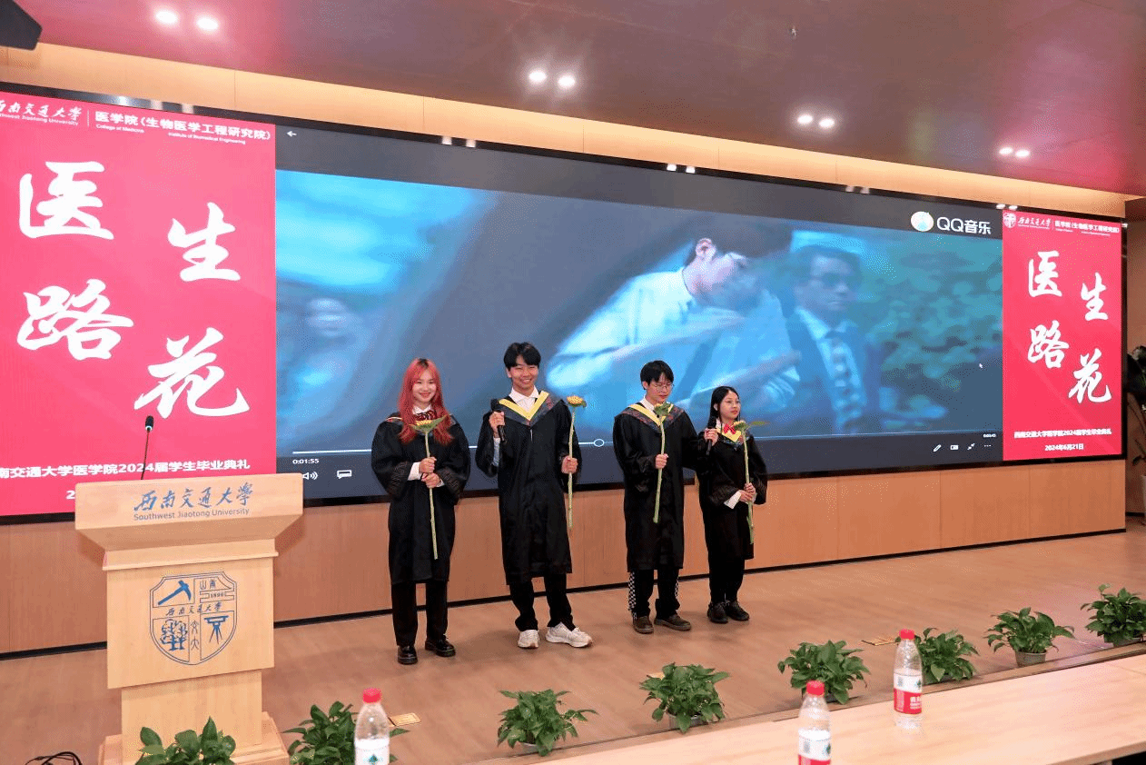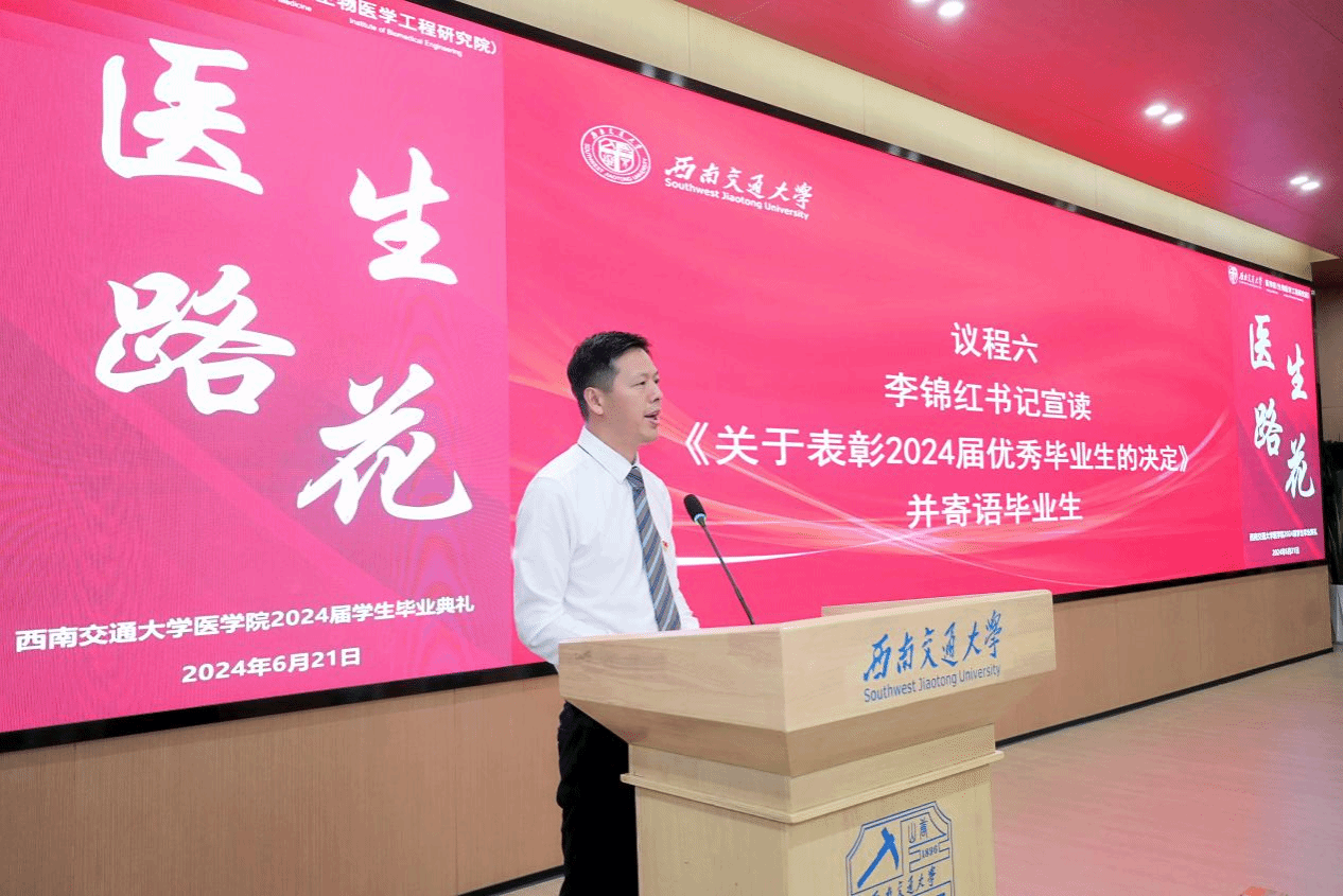 在授位仪式结束后,李锦红书记宣读了《关于表彰2024届优秀毕业生的决定》,决定授予2名本科生和2名研究生2024届“四川省优秀大学毕业生”、5名本科生和6名研究生2024届“西南交通大学优秀毕业生”荣誉称号。这些优秀毕业生在学业、科研、社会实践等方面都取得了卓越的成绩,他们的事迹激励着在场的每一位同学。李书记指出,“希望这些毕业生们在今后的人生道路上,将自身所学更好地融入中国式现代化的建设当中,既要仰望星空、也要脚踏实地,为引领医学科技创新,建设健康幸福中国做出更大的贡献。”同时,号召学院全体在校学生向优秀毕业生学习,为建设具有医工结合特色的研究型36365线路检测中心,为建设交通特色鲜明的世界一流大学贡献力量!随后,周绍兵院长、李锦红书记为优秀毕业生代表颁奖。