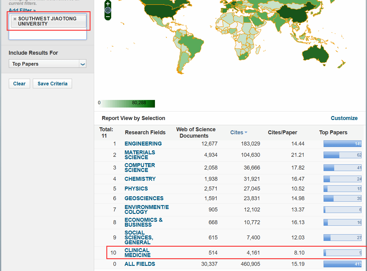 根据最新数据统计,本期全球共有6619个机构的临床医学学科进入ESI全球排名前1%(其中,大陆高校174所),西南交通大学位于全球6571位。西南交通大学临床医学学科发表在SCI和SSCI期刊上的论文共514篇,总被引4161次,篇均被引8.10次,高被引论文9篇,热点论文1篇。