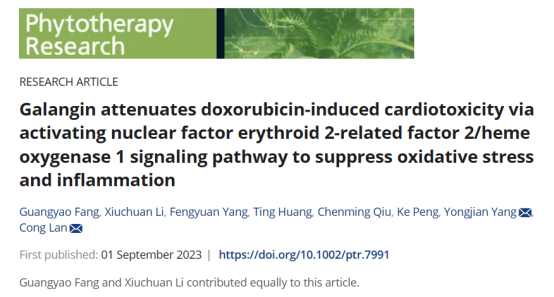 2023年9月1日,我院2021级硕士研究生方光耀以第一作者身份在国际知名期刊Phytotherapy research(中科院2区,IF:7.2)发表原创性基础研究论文“Galangin attenuates doxorubicin-induced cardiotoxicity via activating nuclear factor erythroid 2-related factor 2/heme oxygenase 1 signaling pathway to suppress oxidative stress and inflammation”。该成果揭示了高良姜素(Galangin,Gal)通过激活Nrf2/HO-1通路来抑制化疗药物阿霉素诱发的氧化应激、炎症和细胞凋亡,从而治疗心肌损伤,改善心功能。西部战区总医院心内科李秀川博士为本文的共同第一作者,36365线路检测中心/西部战区总医院心内科杨永健教授、兰聪博士为本论文通讯作者。