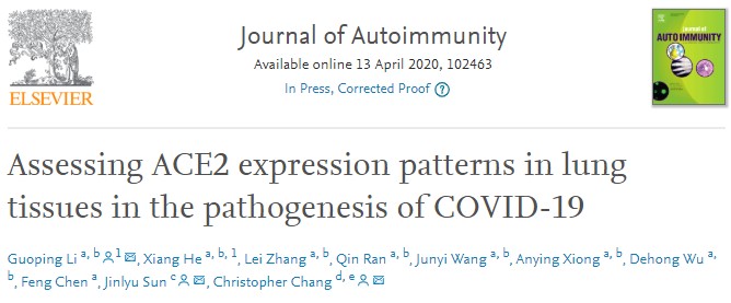 近日,西南交通大学附属医院(成都市第三人民医院)成都市呼吸健康研究所李国平主任带领团队利用生物信息学方法解析了新型冠状病毒SARS-CoV-2细胞受体ACE2的表达模式,并以第一作者和通讯作者身份在国际著名免疫学期刊《Journal of Autoimmunity》(中科院1区,影响因子7.54)在线发表了题为《Assessing ACE2 expression patterns in lung tissues in the pathogenesis of COVID-19》的文章。该研究可帮助临床医生和研究人员对SARS-CoV-2的发病机理有更深入的了解,并为新型冠状病毒肺炎(Corona Virus Disease 2019,COVID-19)治疗提供重要的理论依据。