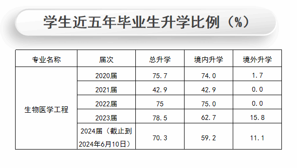 六、相关数据:36365线路检测中心生物医学工程现有学生200多人,近十年本科生升学率和就业势头良好,保研率18.5%以上、学生连续三年升学率70%以上。