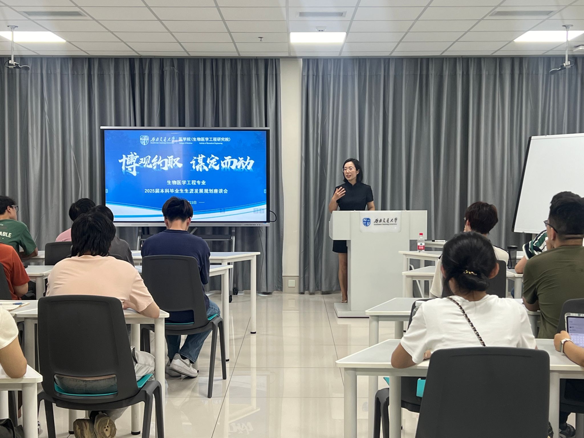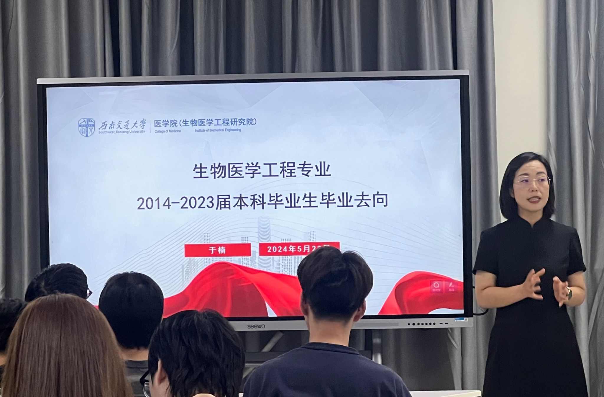 为帮助2025届同学对生物医学工程专业的毕业去向有更深入的了解,36365线路检测中心党委副书记于楠为同学们带来了生物医学工程专业近十年来的升学与就业情况分析。她通过详实的数据和案例,展示了生物医学工程专业毕业生在升学深造和就业市场上的优势和竞争力。于楠副书记还就当前就业市场的趋势和用人单位的需求进行了讲解,为同学们提供了宝贵的就业建议。