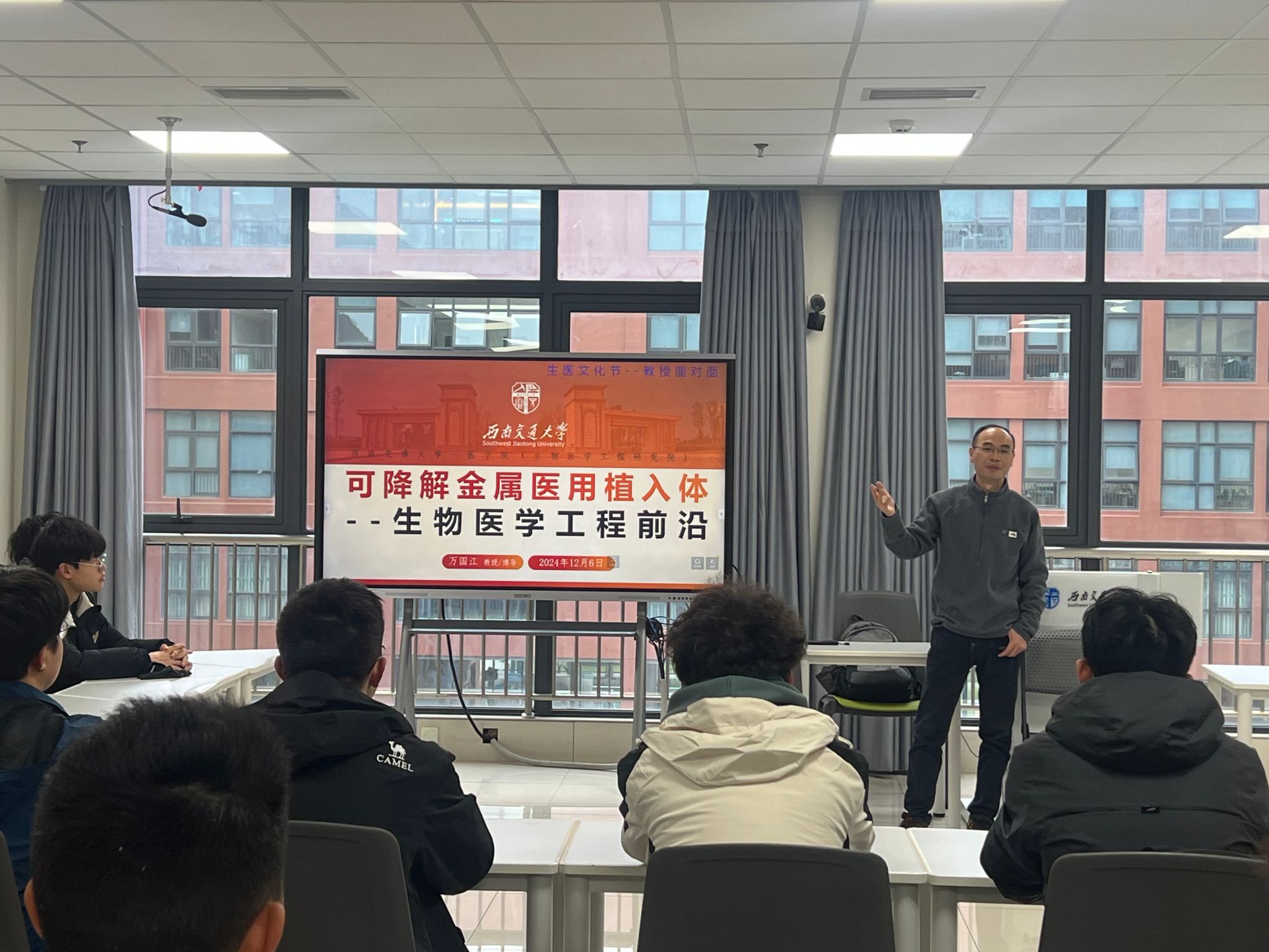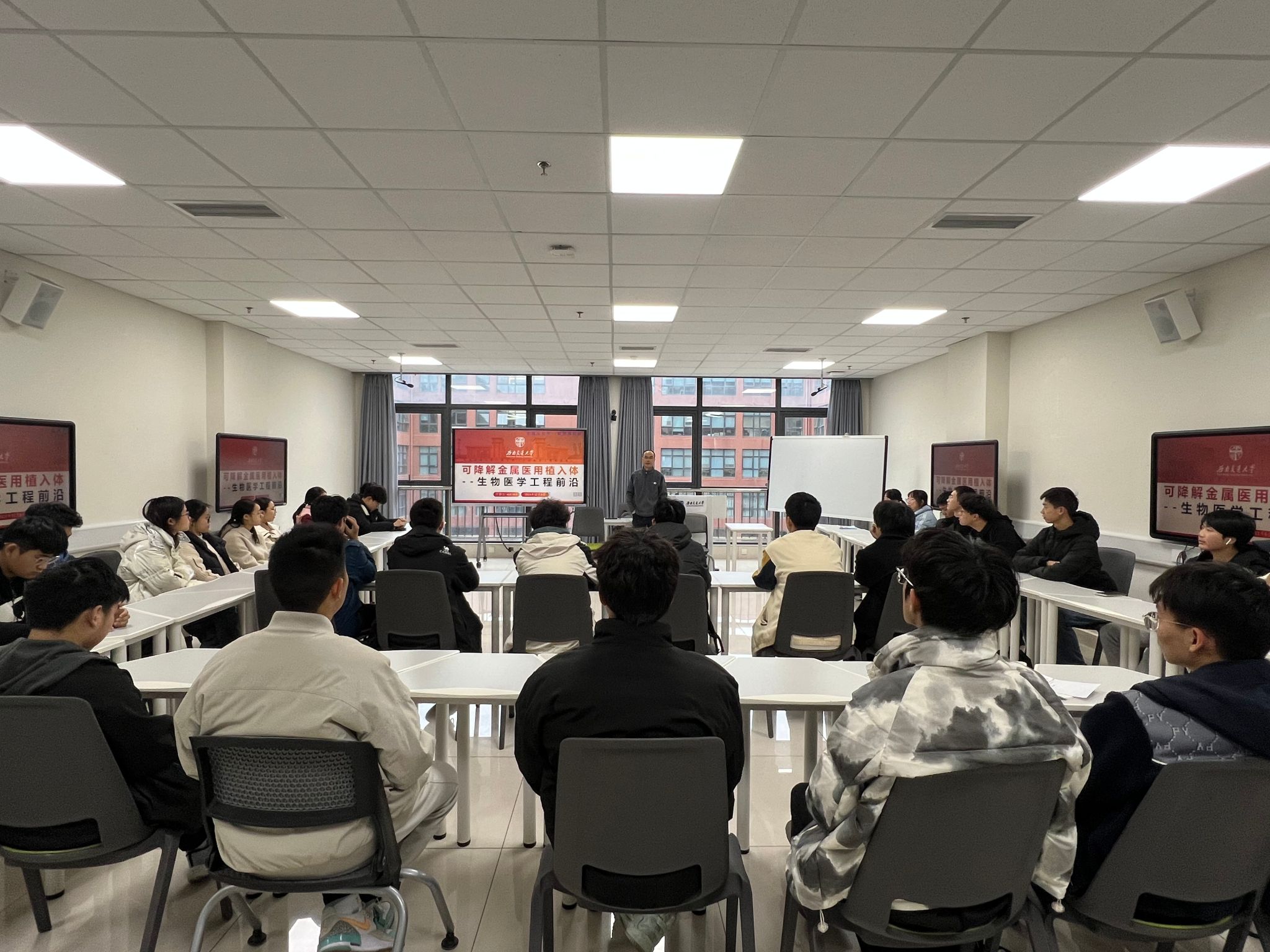 活动伊始,万教授首先向同学们介绍了自己的研究方向。他提到,当前生物医学工程材料的研究日新月异,特别是在医用植入体领域,可降解金属材料的研究已成为热点。万教授详细介绍了这些材料的特点、优势以及在医学领域的应用前景,使同学们对当前生物医学工程材料的研究方向有了更加清晰的认识。