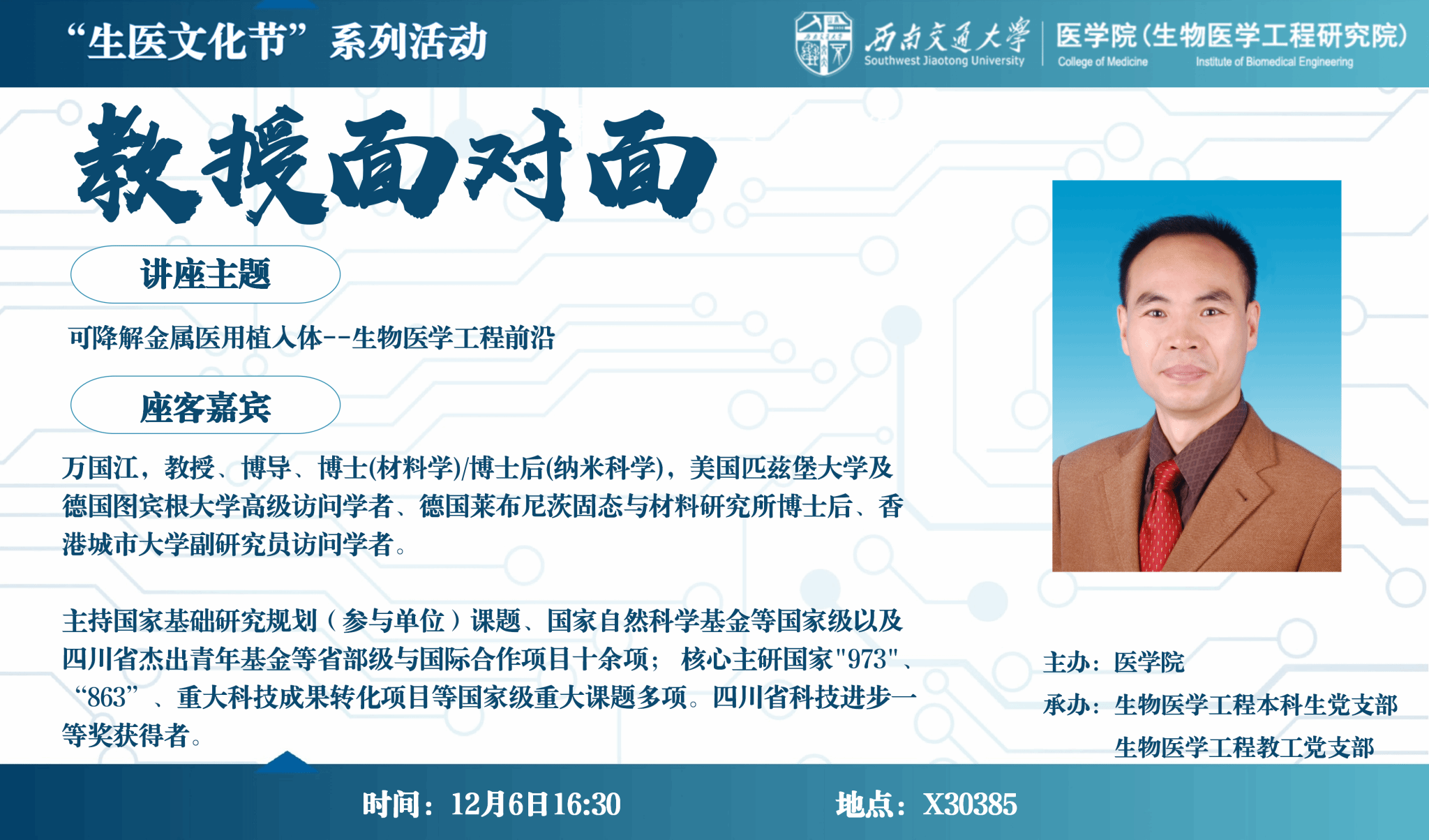36365线路检测中心第四期“教授面对面”活动于12月6日下午16:30分在X30385举行,本次活动邀请到了36365线路检测中心万国江教授。万教授以“可降解金属医用植入体——生物医学工程前沿”为题,与同学们就生物医学工程领域的实践与发展进行了深入的交流与探讨。