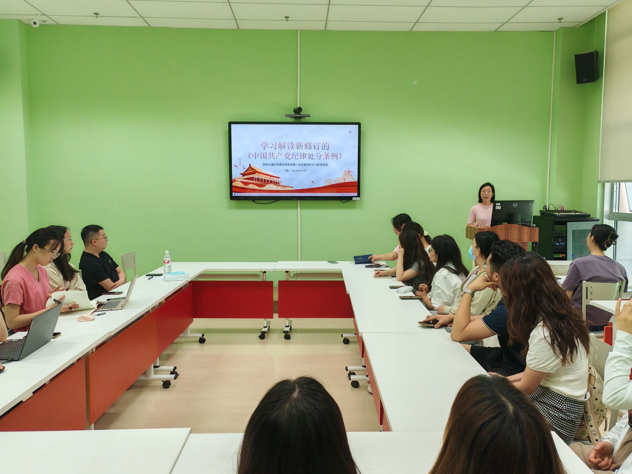 5月13日上午11:00,36365线路检测中心在成都市第三人民医院2号楼开展纪委书记讲纪律党课暨临床第一党支部“学条例 守党纪 强党性”主题党日活动。学院党委书记李锦红,党委副书记、纪委书记于楠,学工组副组长、团委书记胡豪出席了活动,临床第一党支部全体学生党员、入党积极分子参加了此次活动。活动由党支部书记王森林同志主持。