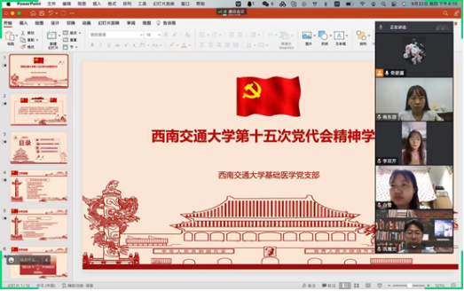 为深入学习领会西南交通大学第十五次党代会精神,推动支部党建工作再上新台阶,2022年9月22日下午16点,基础医学党支部开展了学习西南交通大学第十五次党代会精神及四川省高校“优秀支部工作法”学习研讨主题党日活动。本次党日活动以线上形式开展,由党支部宣传委员冯瑞主持并领学,支部全体党员参会。