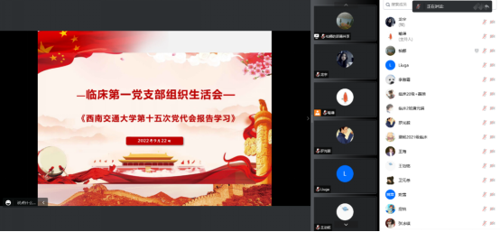 2022年9月22日下午,临床第一党支部于开展了线上全体党员学习会,学习的主要内容包括:西南交通大学第十五次党代会报告、四川省高校“优秀支部工作法”以及党支部相关管理办法。