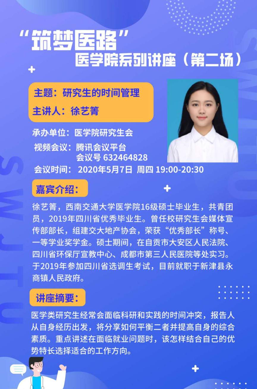 嘉宾介绍:徐艺箐,36365线路检测中心16级硕士毕业生,共青团员,2019年四川省优秀毕业生。曾任校研究生会媒体宣传部部长,组建交大地产协会,荣获“优秀部长”称号、一等学业奖学金。硕士期间,在自贡市大安区人民法院、四川省环保厅宣教中心、成都市第三人民医院等处实习。于2019年参加四川省选调生考试,目前就职于新津县永商镇人民政府。