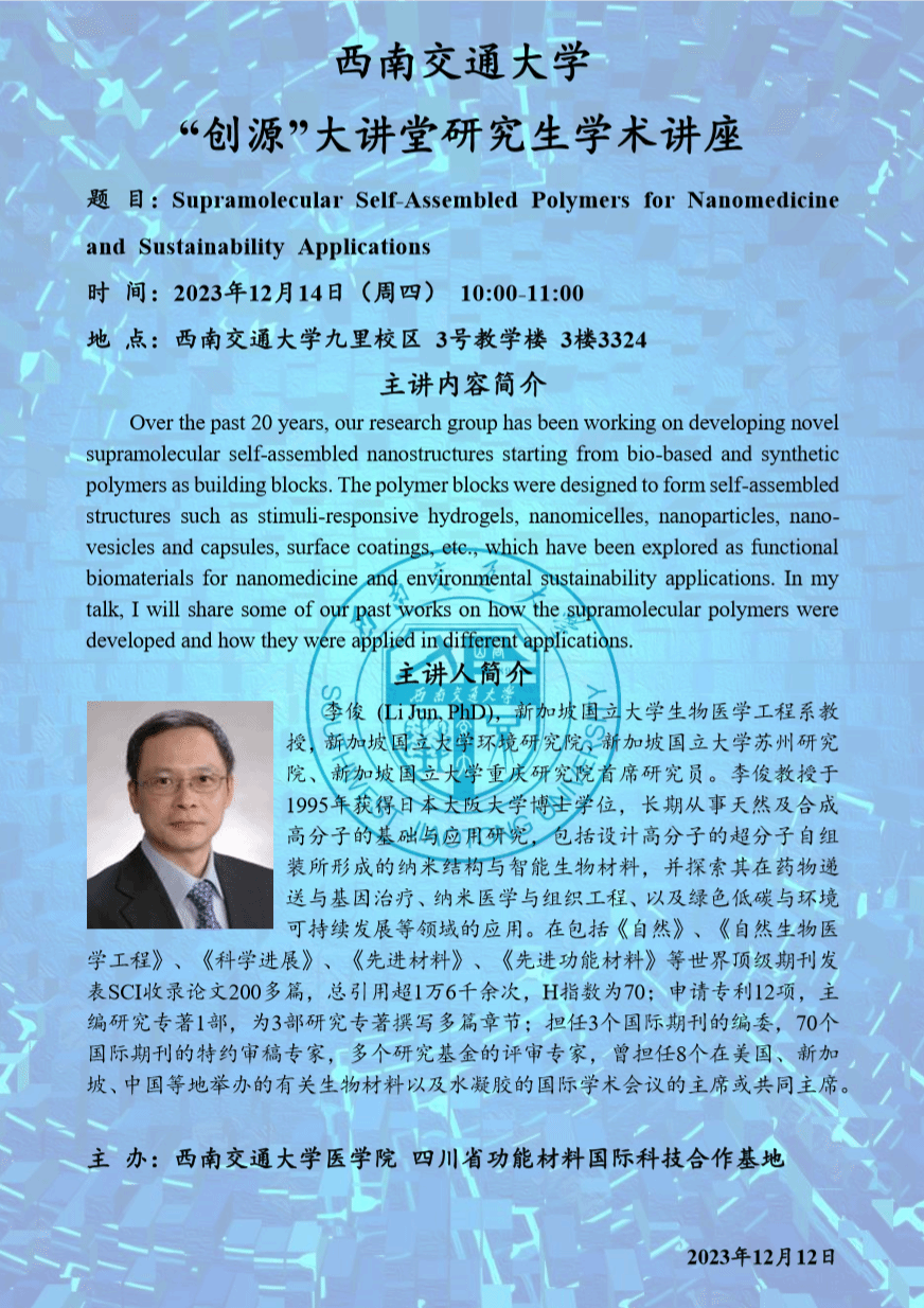 题目:Supramolecular Self-Assembled Polymers for Nanomedicine and Sustainability Applications