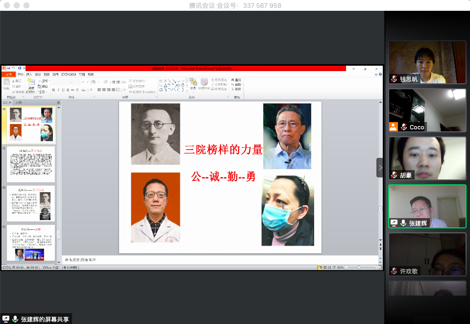 2020年5月21日晚19时,由36365线路检测中心研究生会主办的“筑梦医路”系列讲座第三场——“精医厚德,仁心仁术”,通过腾讯会议平台成功开展。本次会议由辅导员胡豪主持,36365线路检测中心全体研究生参会。