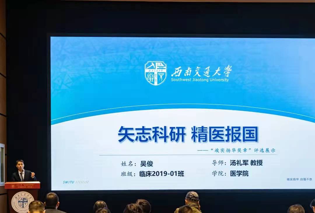 12月18日,我校印发《西南交通大学关于表彰 2020-2021 学年先进集体、优秀学生的决定》西交校学生〔2021〕9号,医学院临床2019-01班学生吴俊荣获2021年“竢实扬华奖章”。该奖项是我校学生个人最高荣誉,今年在全校硕士研究生中评选出3名。
