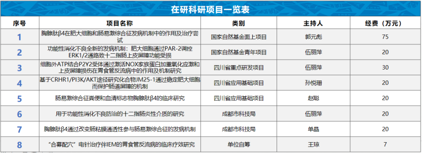 团队先后获得各类科研基金200多万元,其中国家自然科学基金面上项目1项,国家自然科学基金青年项目1项,四川省科技计划项目4项,另获多项成都市科技局科研课题、四川省卫健委课题和成都市卫健委课题;近3年,在国内外学术刊物上发表论文18篇,其中以第一/通讯作者发表SCI论文12篇。获得国家发明专利3项。