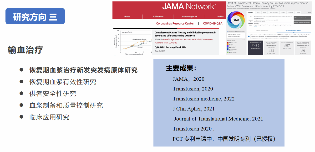 获批四川省重点项目等各级项目十余项;发表文章80余篇,其中在 JAMA、Transfusion 等发表SCI论文30多篇,发明专利5项;参与编写专著 4 本,参与编写专家共识 3 个,参与编制国家卫生行业标准2个。